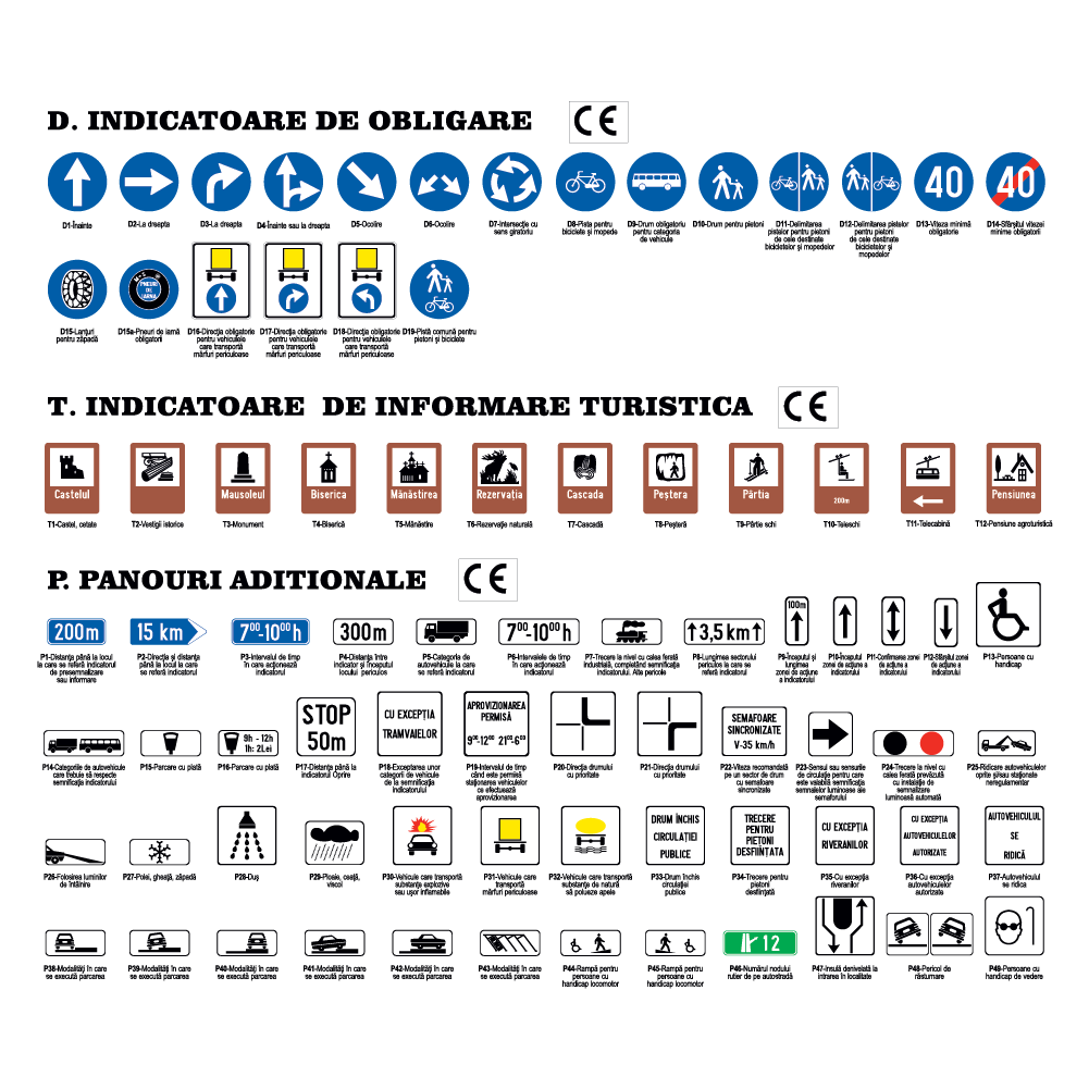 Sunt confectionate din tabla zincata, grosime 1mm.,vopsita in camp electrostatic, ambutisata pe margine, acoperita cu folie EGP Clasa1/Clasa2/Clasa3 pe partea activa, in functie de tipul de drum unde vor fi amplasate, conform STAS1848/2011.